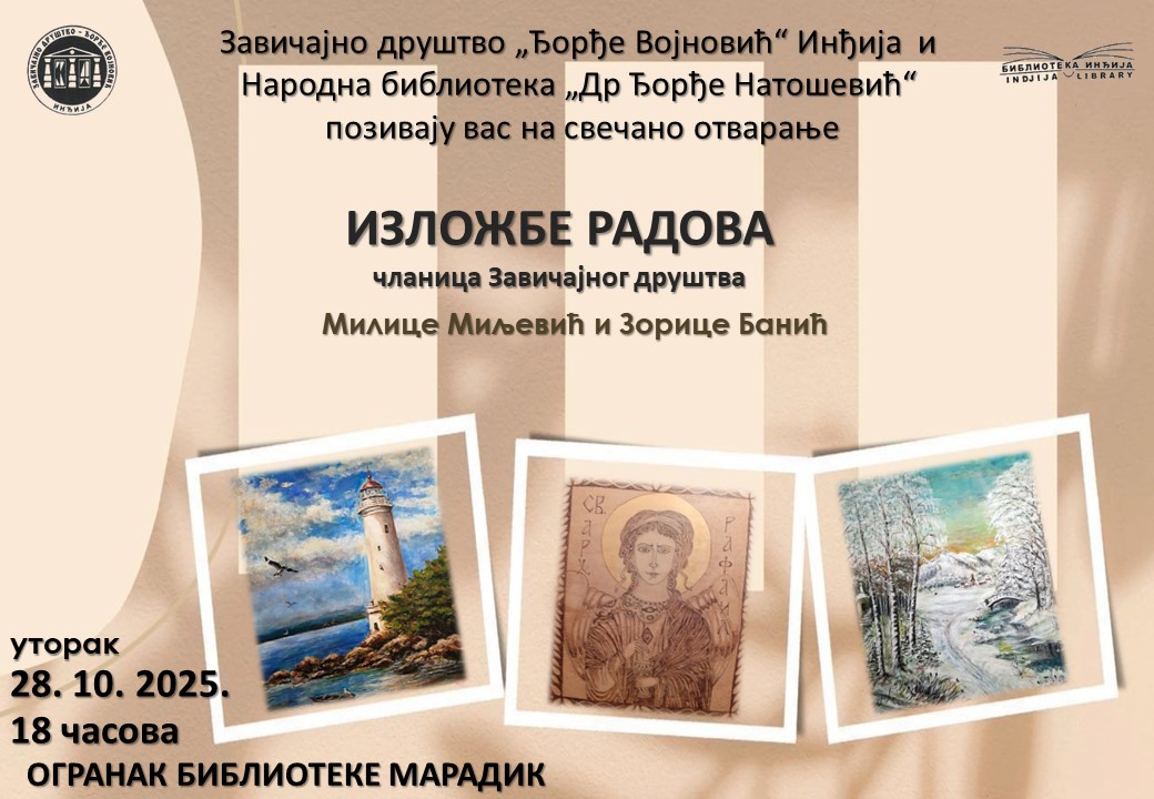 У оквиру успешне сарадње инђијске Библиотеке и Завичајног друштва „Ђорђе Војновић“ из Инђије биће организована још једна у низу изложби. Своје радове изложиће чланице Завичајног друштва Зорица Банић и Милица Миљевић.