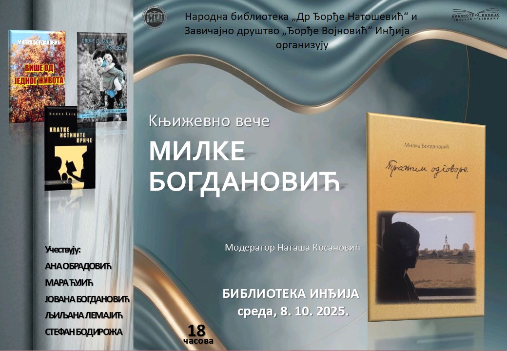 Народна библиотека „Др Ђорђе Натошевић“ и Завичајно друштво „Ђорђе Војновић“ Инђија организују књижевно вече Милке Богдановић из Путинаца. Љубитељи писане речи имаће прилику да се упознају са ауторком и њеним стваралаштвом у среду, 8. октобра 2025. године, у 18 часова, у читаоници Библиотеке у Инђији.
