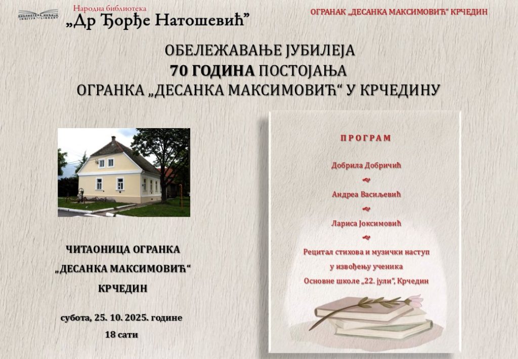 Статистика: 157 0 Датум: 24.10.2025. Категорија: Актуелно Обележавање јубилеја – 70 година огранка „Десанка Максимовић“ у Крчедину Light Dark Претходни Одржана додела награда на литерарном конкурсу Завичајног друштва Следећи Изложба чланица Завичајног друштва „Ђорђе Војновић“