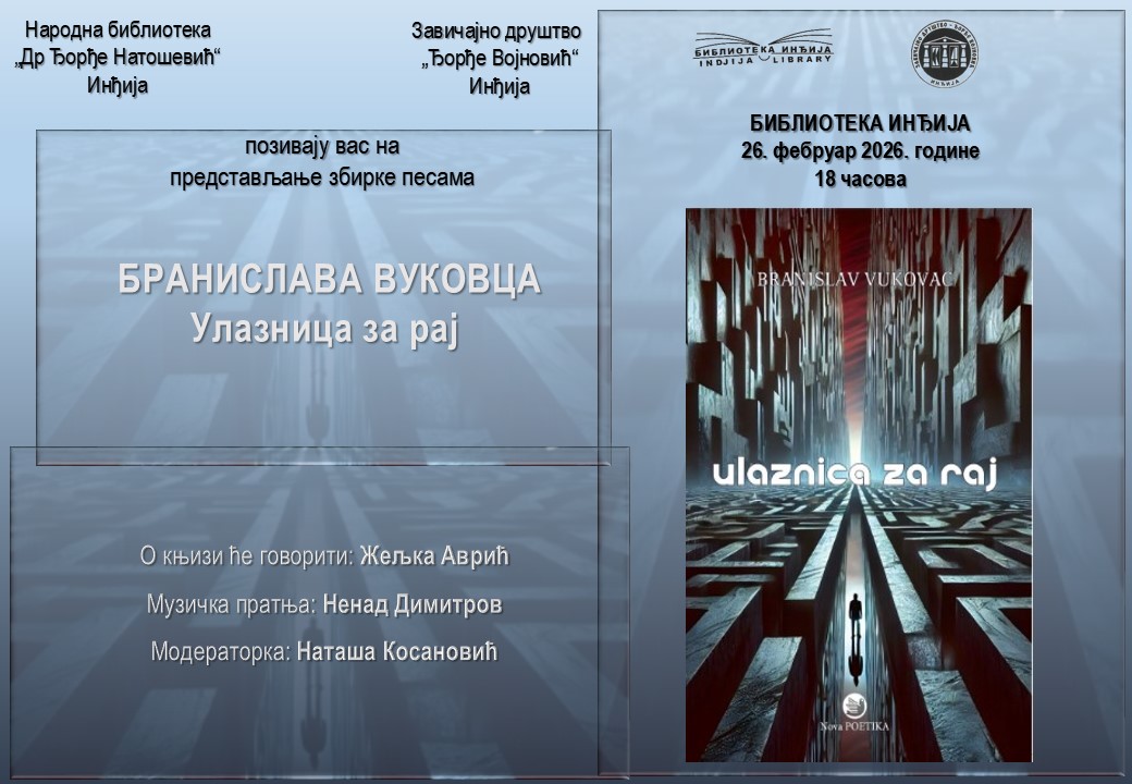 У организацији Народне библиотеке “Др Ђорђе Натошевић” из Инђије и Завичајног друштва “Ђорђе Војновић” Инђија, у четвртак, 26. фебруара 2026. године, са почетком у 18 сати, биће представљена збирка поезије „Улазница за рај“ аутора Бранислава Вуковца.