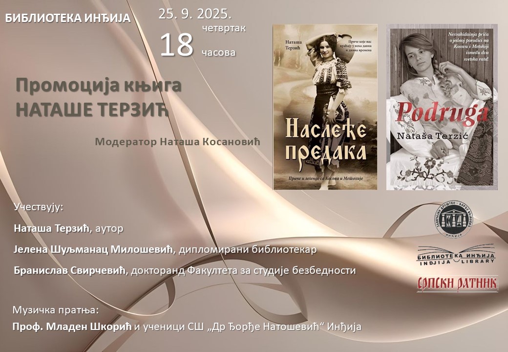 У четвртак, 25. септембра 2025. године, са почетком у 18 часова, у Народној библиотеци „Др Ђорђе Натошевић“ у Инђији одржаће се промоција књига „Наслеђе предака“ и „Подруга“ књижевнице Наташе Терзић.